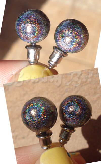 Escolhi dois pares de brincos na cor prata, no primeiro passei o esmalte preto da Impala, e por cima o holográfico Hefesto, da Hits, Speciallità: